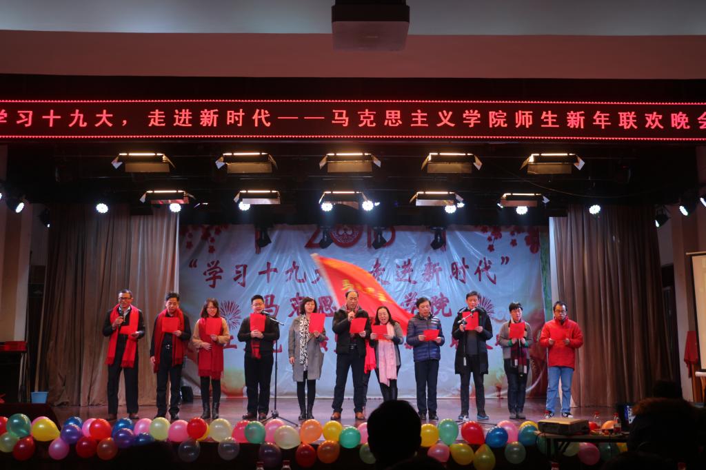第二轮新年抽奖后, 大二班级带来朗诵与合唱表演——《我爱你中国》,诉说着她们的爱国情怀;大一同学的吉他弹唱《突然好想你》以及研究生带来的《黄四姐》特色表演,赢得在场师生的阵阵掌声;大三全体员工表演的小品《白蛇前传》笑点十足,将晚会气氛推向高潮;最后,大四年级带来表演《写给未来的你》,晚会在回忆和憧憬中落下帷幕。