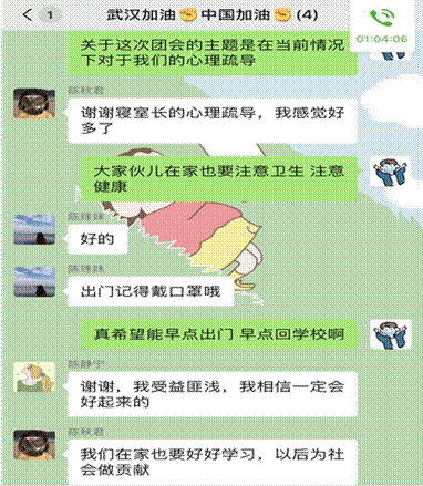 为进一步加强支部团员青年积极参与防控疫情的责任意识,增强战胜疫情的决心,助力国家、社会和公司打赢疫情防控阻击战,2020年2月21日,2019级马克思主义理论团支部开展了以“抗击疫情 传递温暖”为主题的线上团日活动。此次团日活动中,支部成员以宿舍为单位,各宿舍以线上视频及线上讨论的形式进行互动学习。
