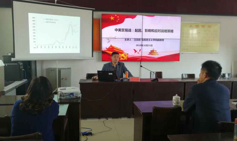 意识形态工作是党的一项极端重要的工作。高翔莲教授的报告以《牢牢掌握意识形态工作领导权》为主题,结合党的十九大精神和农村基层工作实际,解读在当前形势下基层党组织和党员干部如何做好意识形态工作。汪宗田副教授做了《中美贸易战:起因、影响和应对战略策略》的报告,对中美贸易战的原因、发展过程以及中国的应对策略等问题进行了深入探讨。